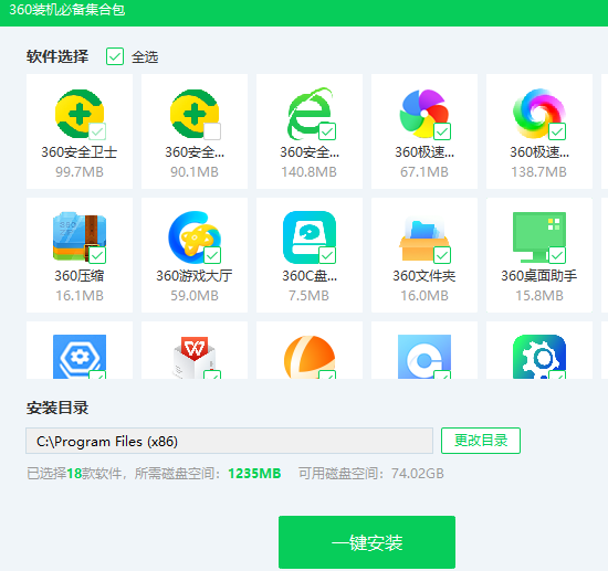 360装机集合包可以方便快捷的为您的电脑系统安装常用必备软件,可以为我们节省不少的时间,所有软件均来自于360打包,安全无毒,适合在刚重装或者新装的系统,这些软件都经过杀毒,用户可以放心下载使用!
